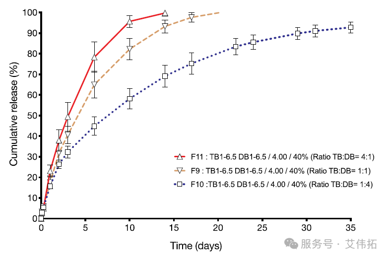 相同TB、DB组合,相同聚合物和活性成分含量,不同TB:DB比例制备的药物储库中Bupivacaine的累计释放量